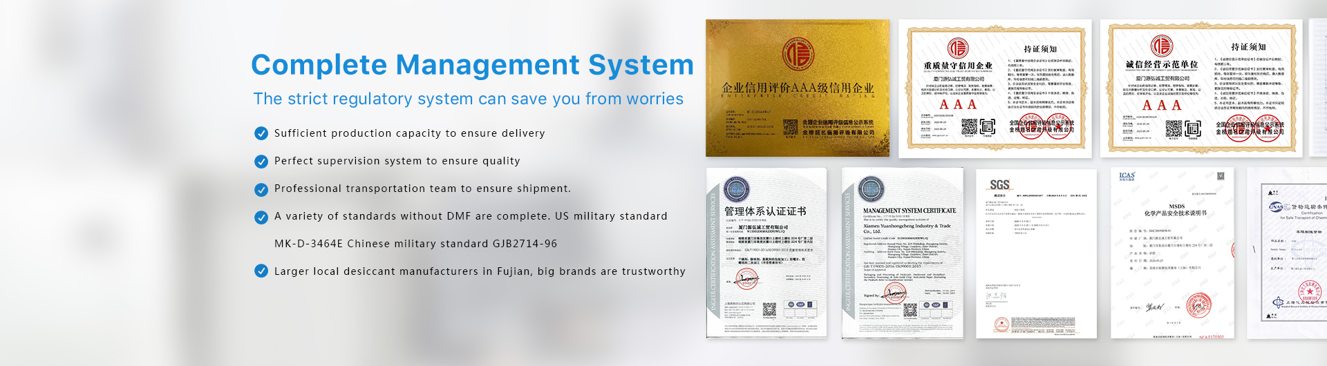 Established in 2002, Xiamen Yuanhongcheng Industry and Trade Co., Ltd. is a large manufacturer specializing in moisture-proof and mildew-proof products. The factory has obtained the ISO9001: 2015 quality management system certification. The certificate number is 11719QU0103-10ROS. Committed to the development and production of desiccant series products, the factory has accumulated years of product packaging, storage, transportation and moisture-proof experience, providing customers with professional and scientific moisture-proof packaging solutions, the most perfect design for the moisture-proof packaging of each product.